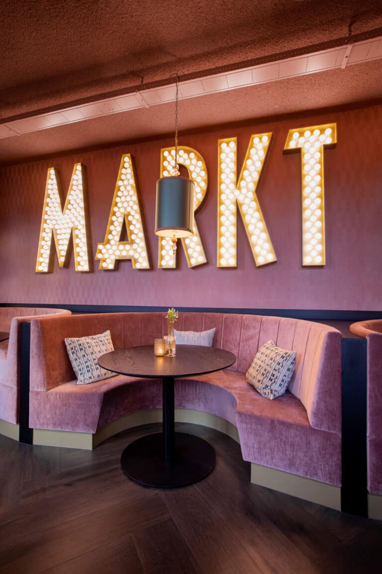 Wat een parel! Voor Grandcafé Markt 14 in Valkenswaard mochten wij het complete interieur vernieuwen. Een aantal hoogtepunten zijn het lichtgevende logo aan de muur, de ronde bar en de hoogwaardig afgewerkte sanitaire ruimtes.