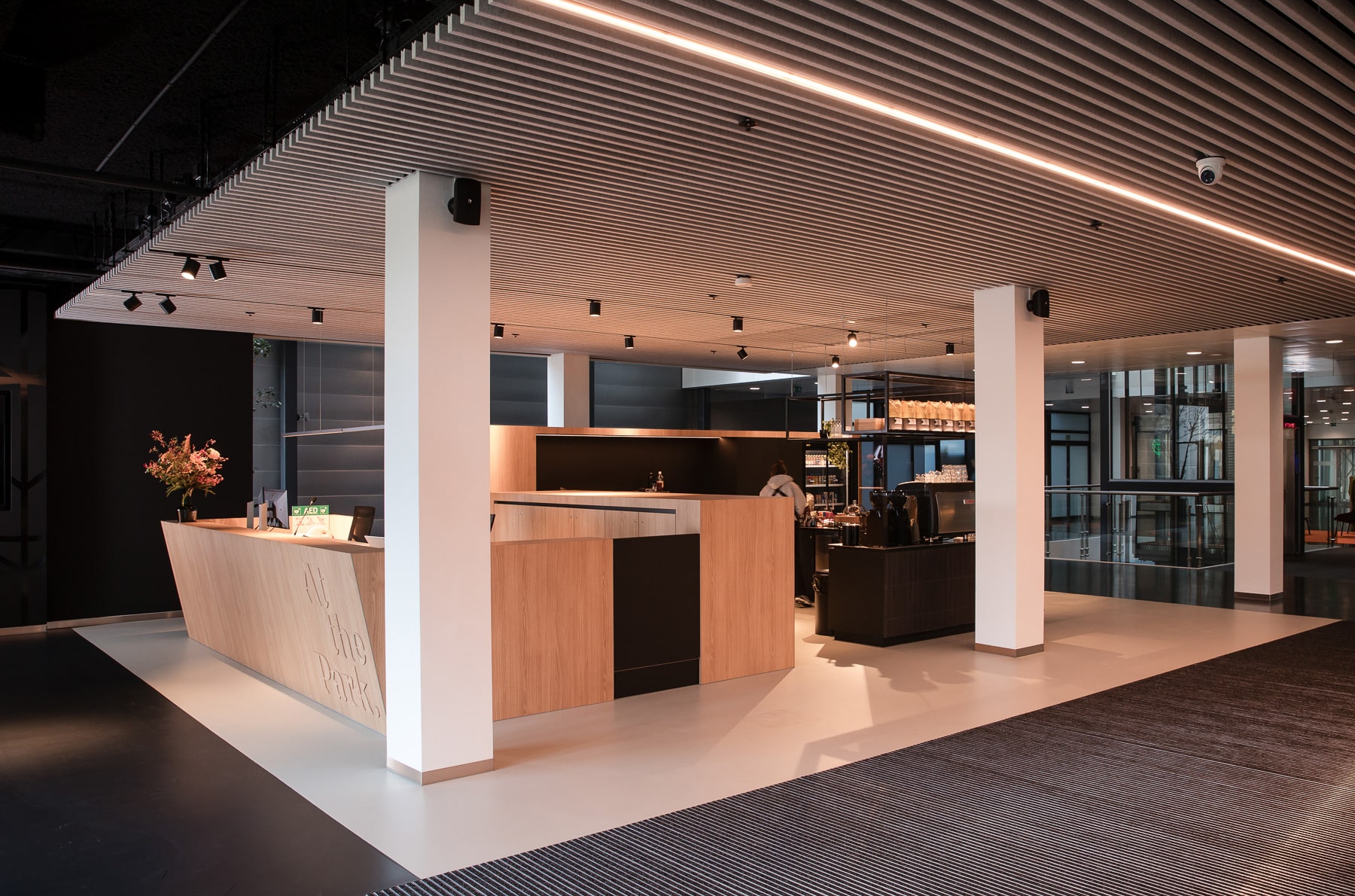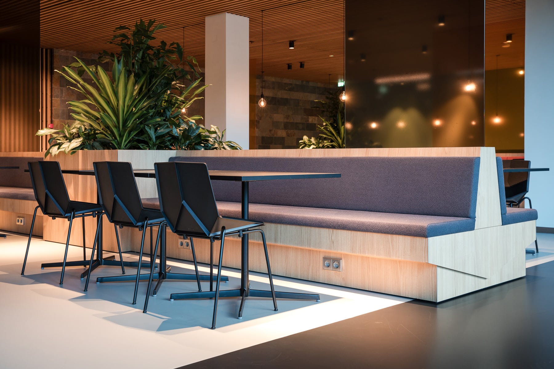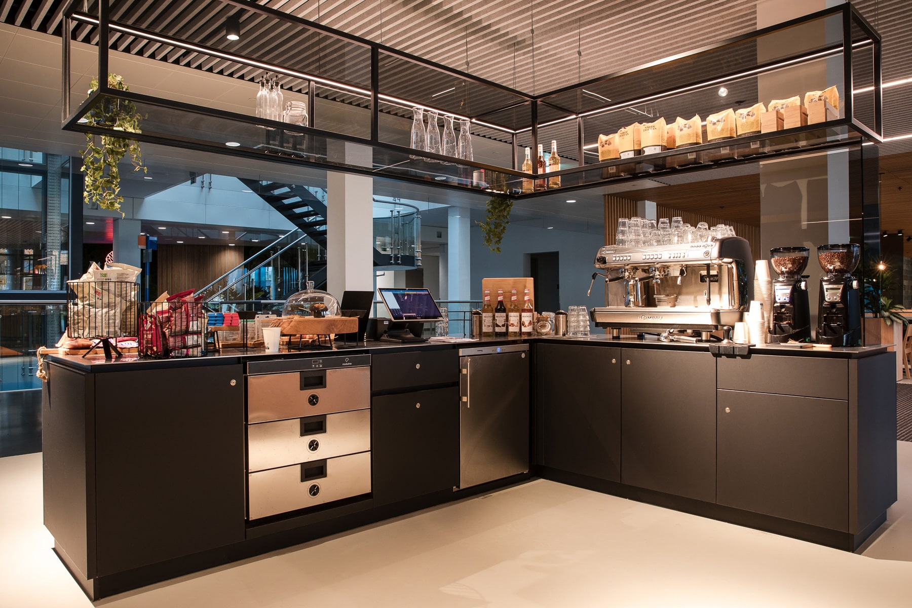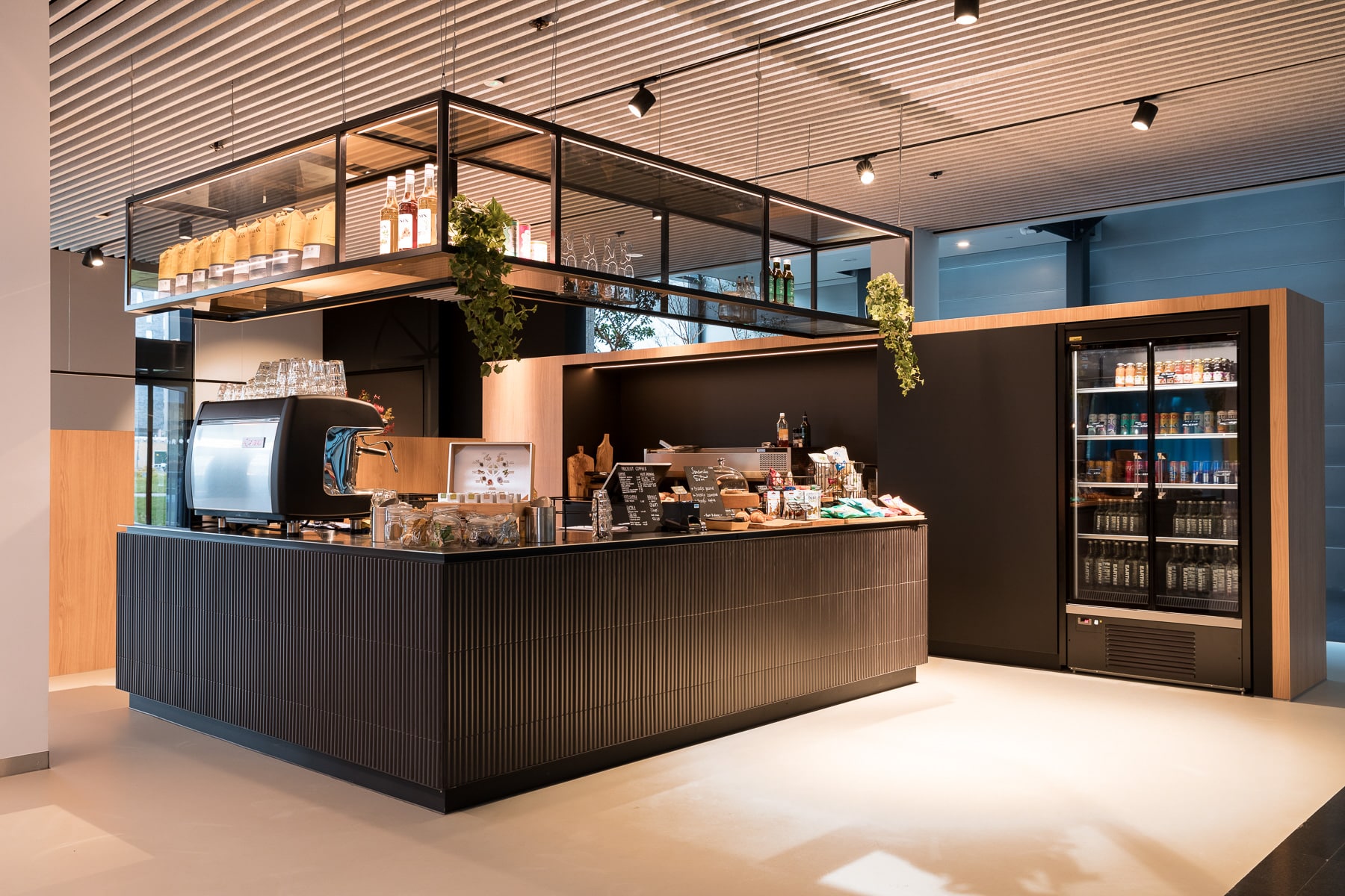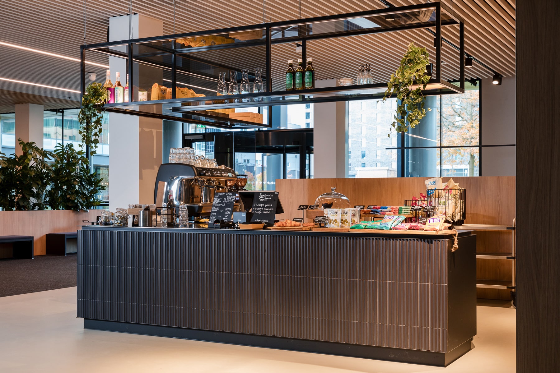 Een volledig op maat gemaakt interieur. De stijl van zowel de keuken, meubels en receptie lopen vloeiend in elkaar over. Meubels lopen over in plantenbakken, wat bijdraagt aan speelsheid en sfeer.