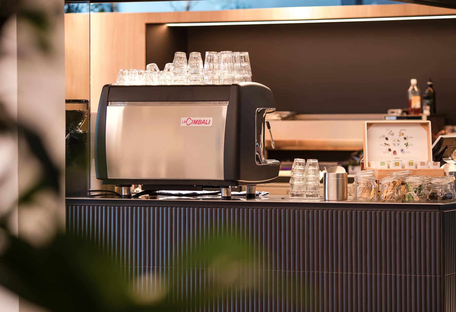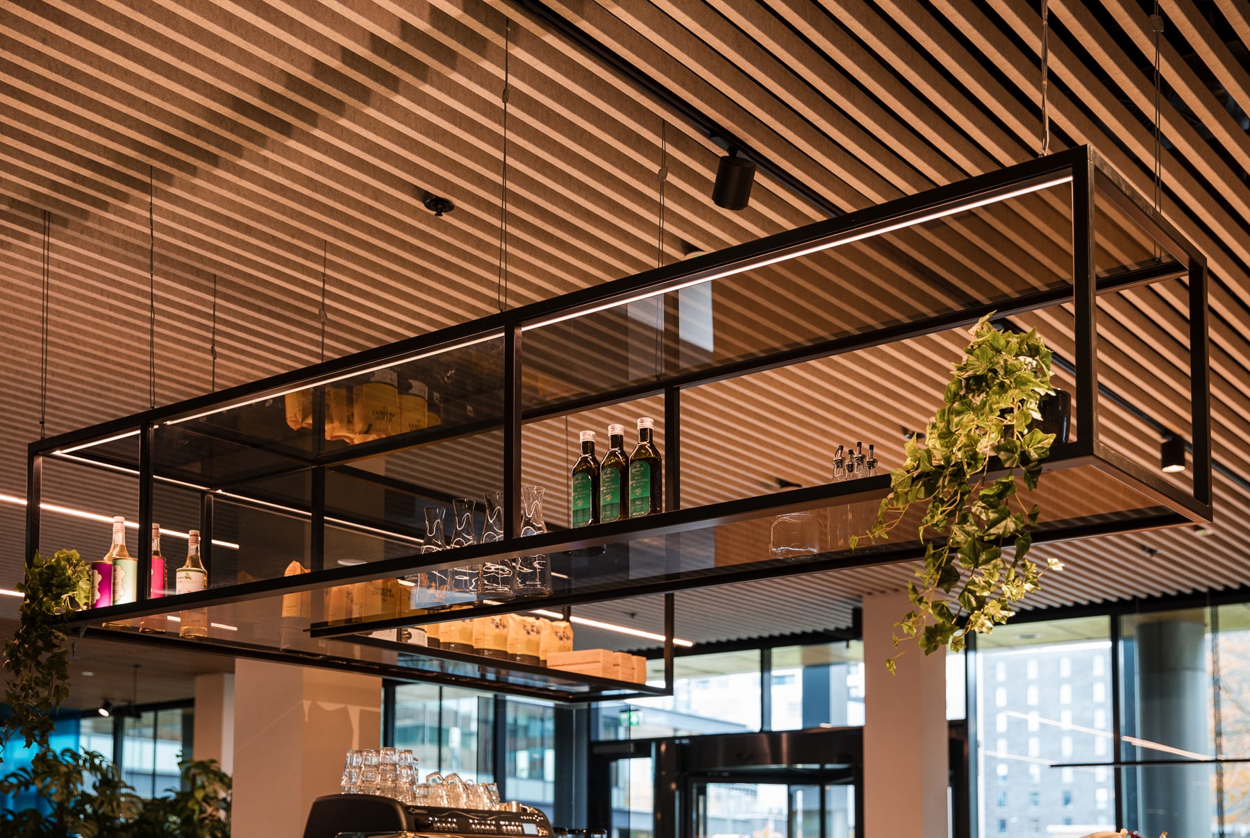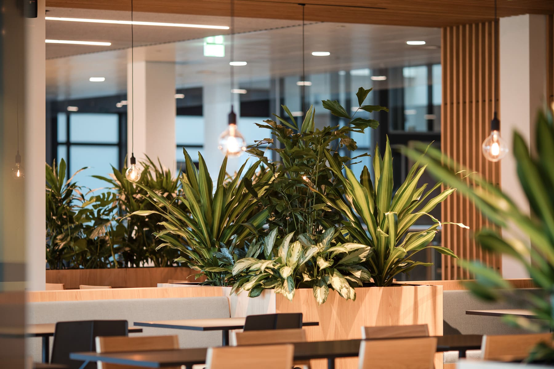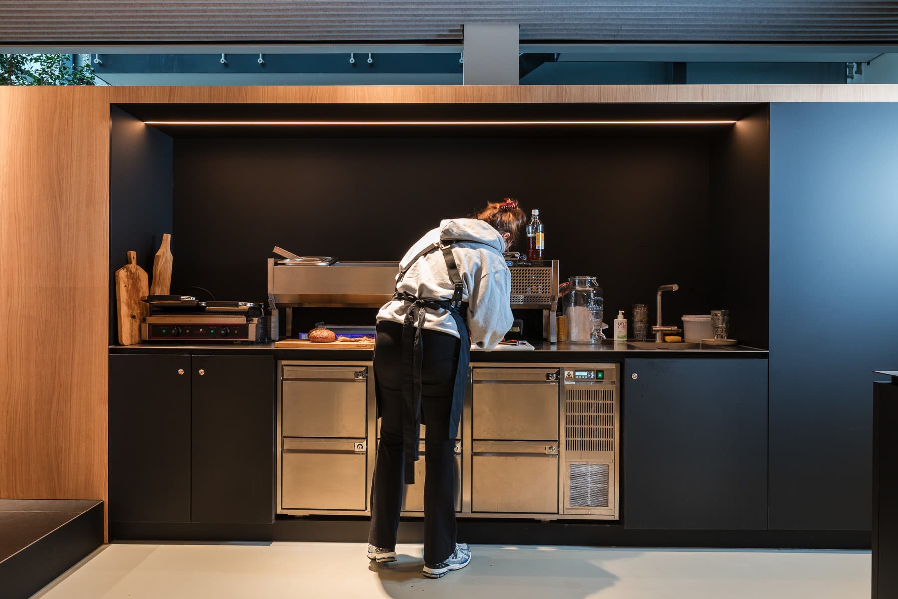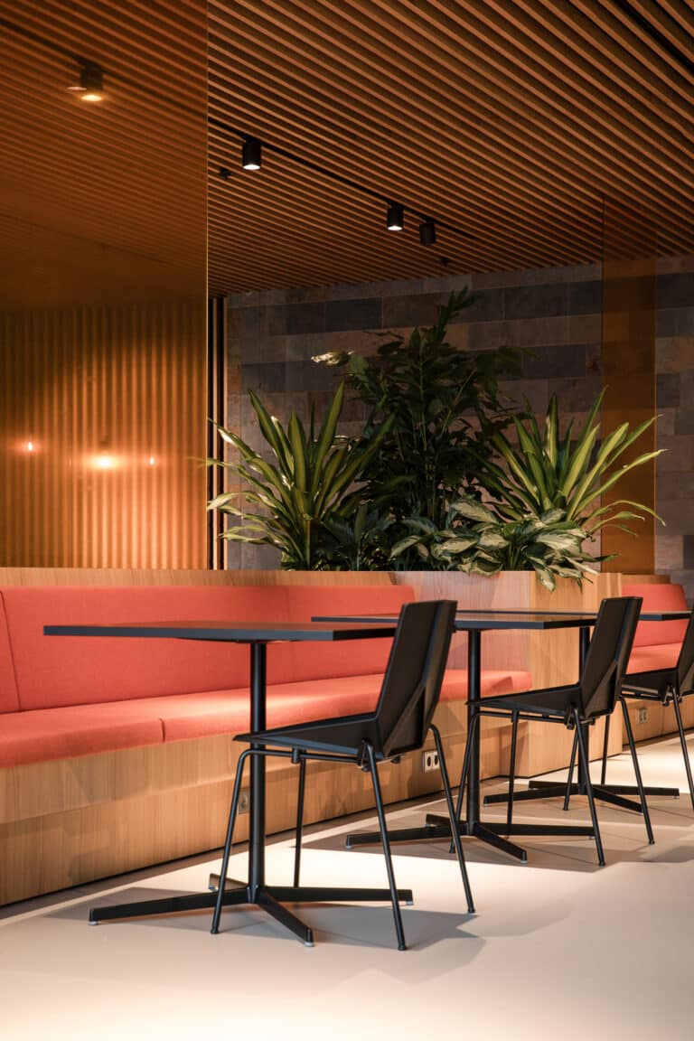 Een volledig op maat gemaakt interieur. De stijl van zowel de keuken, meubels en receptie lopen vloeiend in elkaar over. Meubels lopen over in plantenbakken, wat bijdraagt aan speelsheid en sfeer.