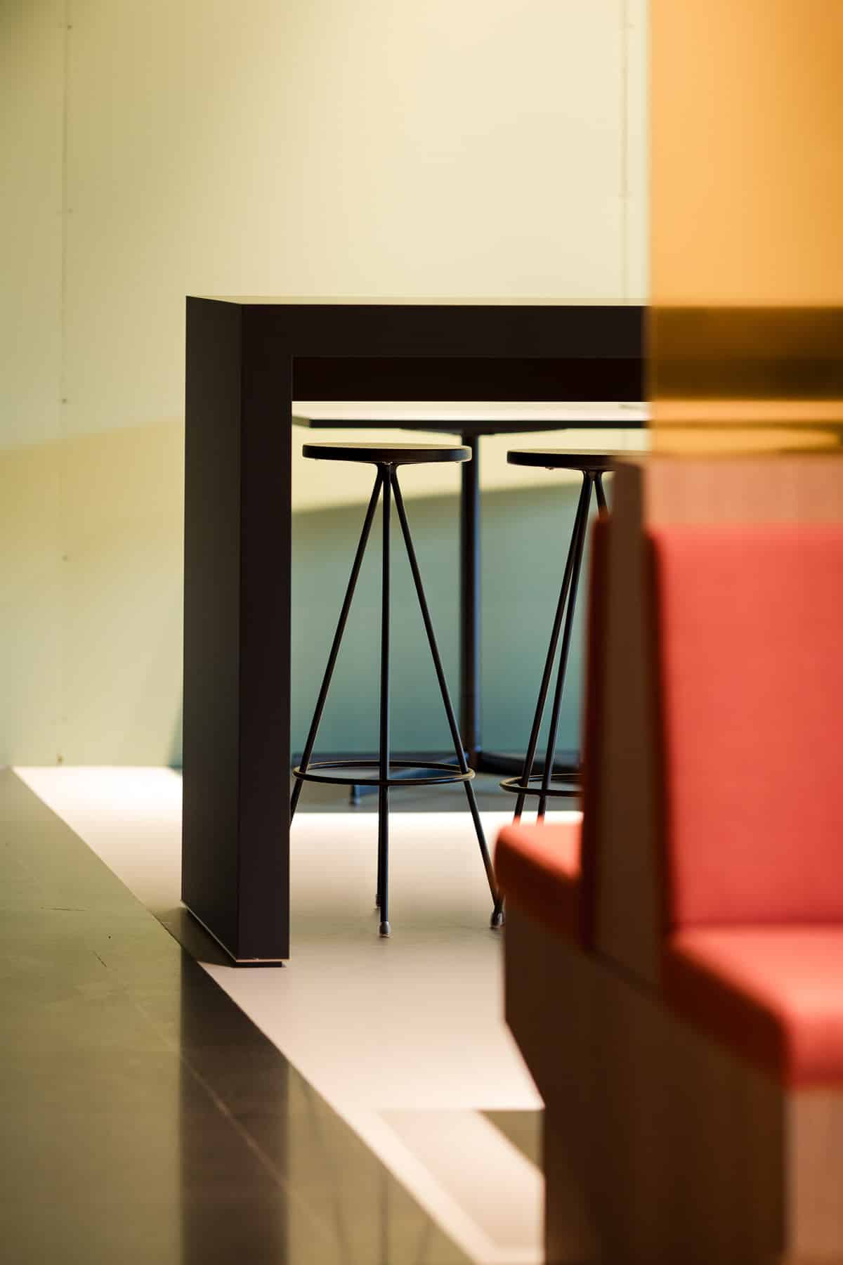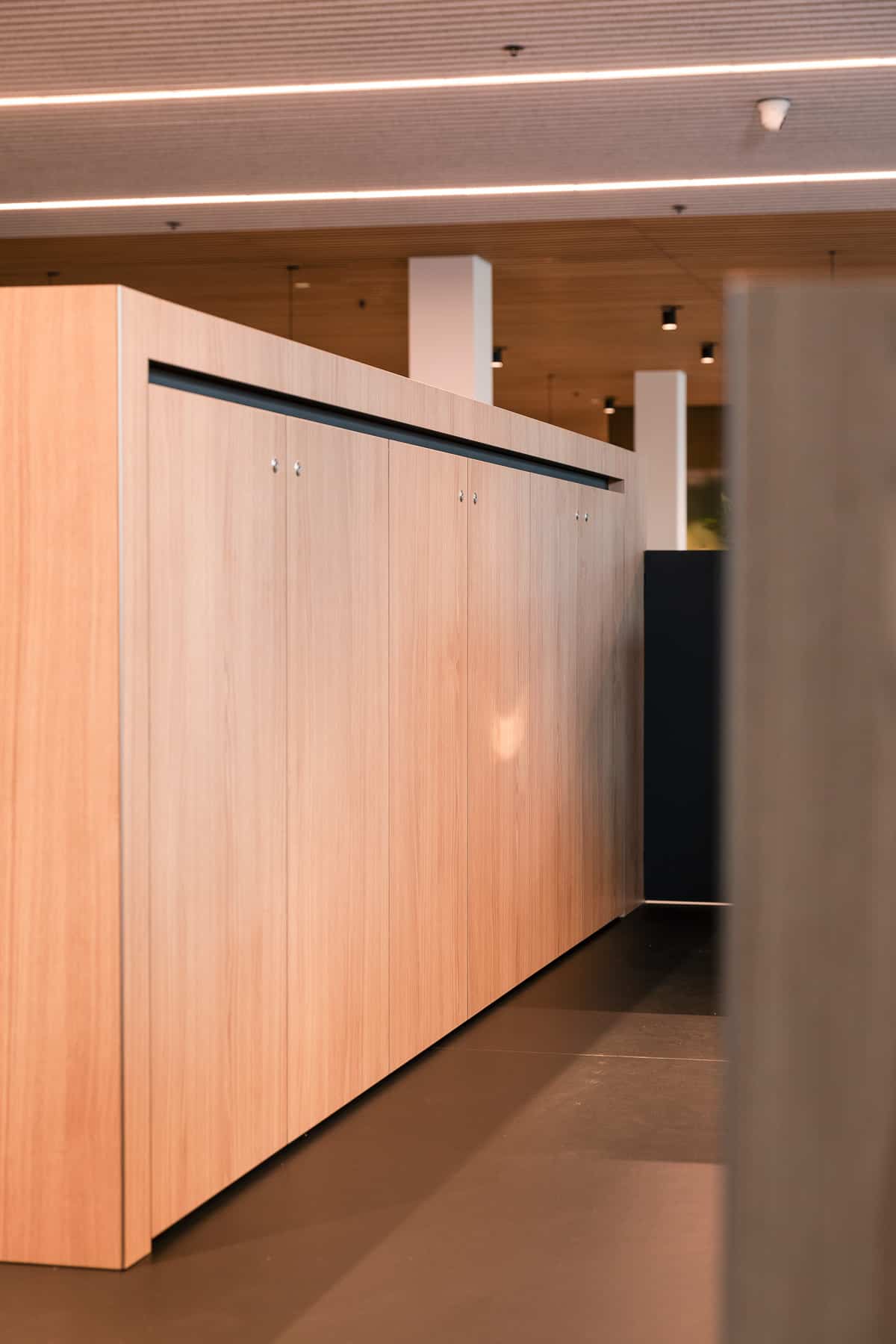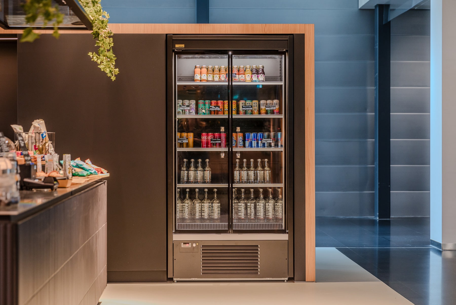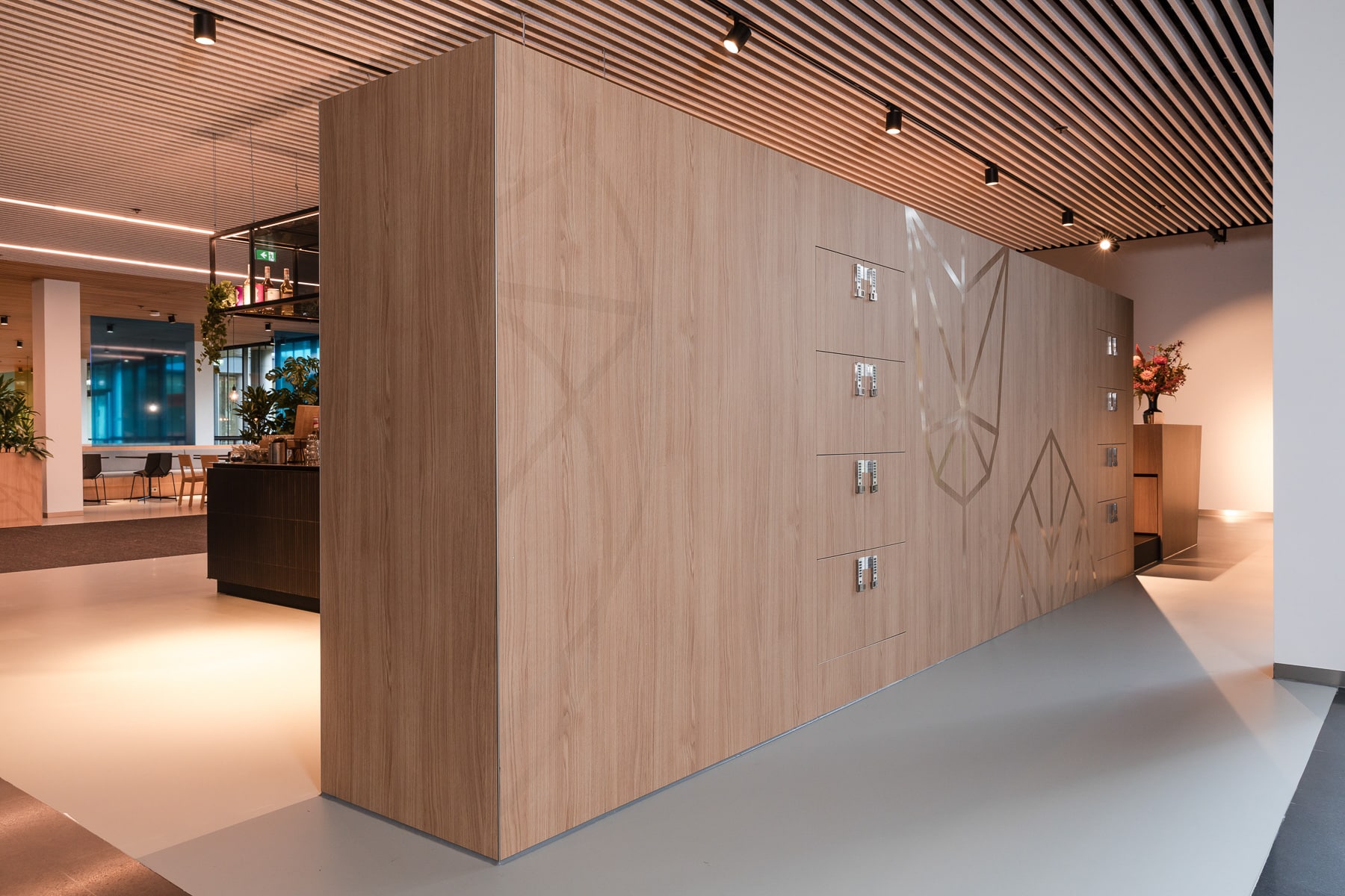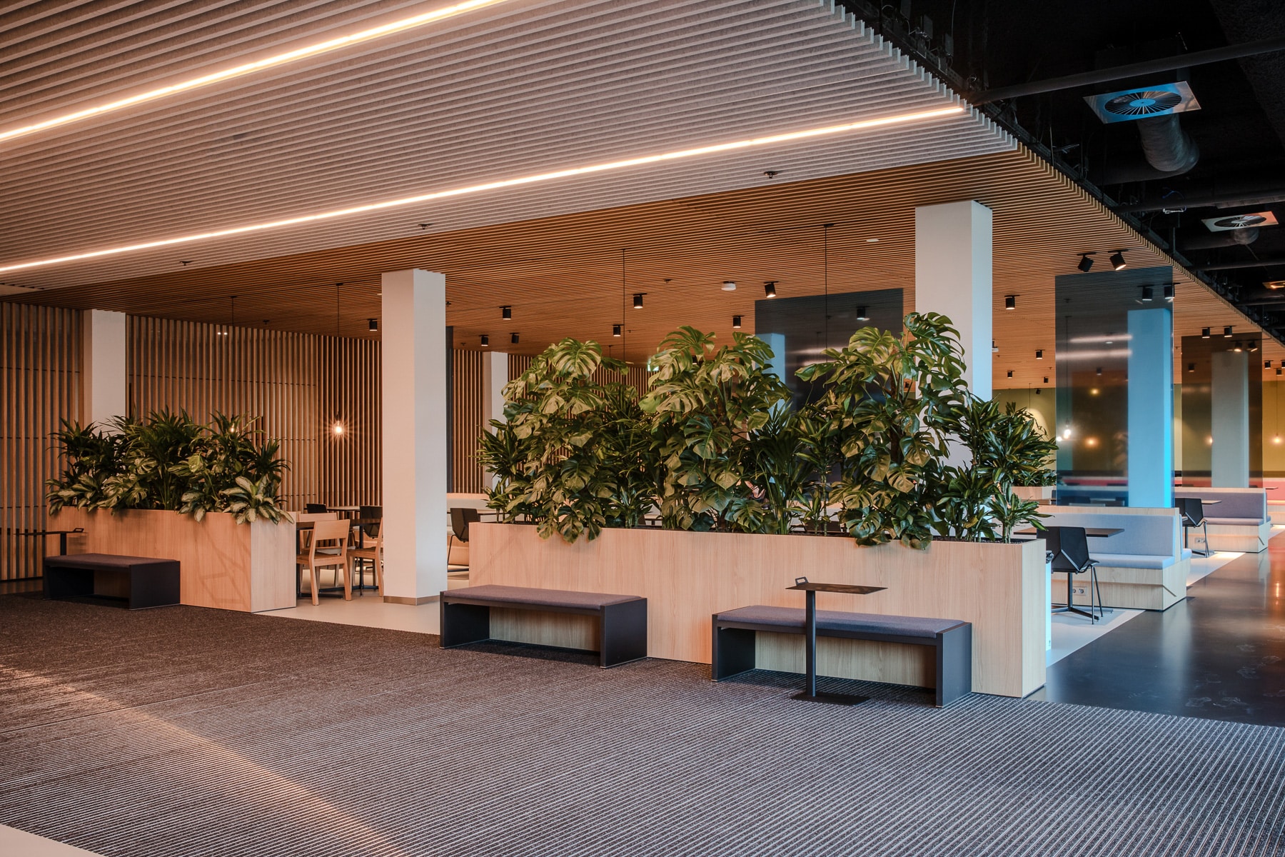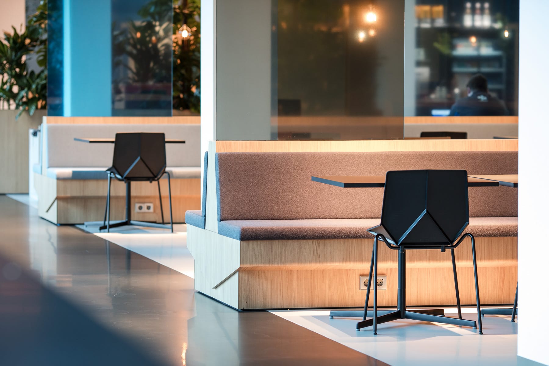Een volledig op maat gemaakt interieur. De stijl van zowel de keuken, meubels en receptie lopen vloeiend in elkaar over. Meubels lopen over in plantenbakken, wat bijdraagt aan speelsheid en sfeer.