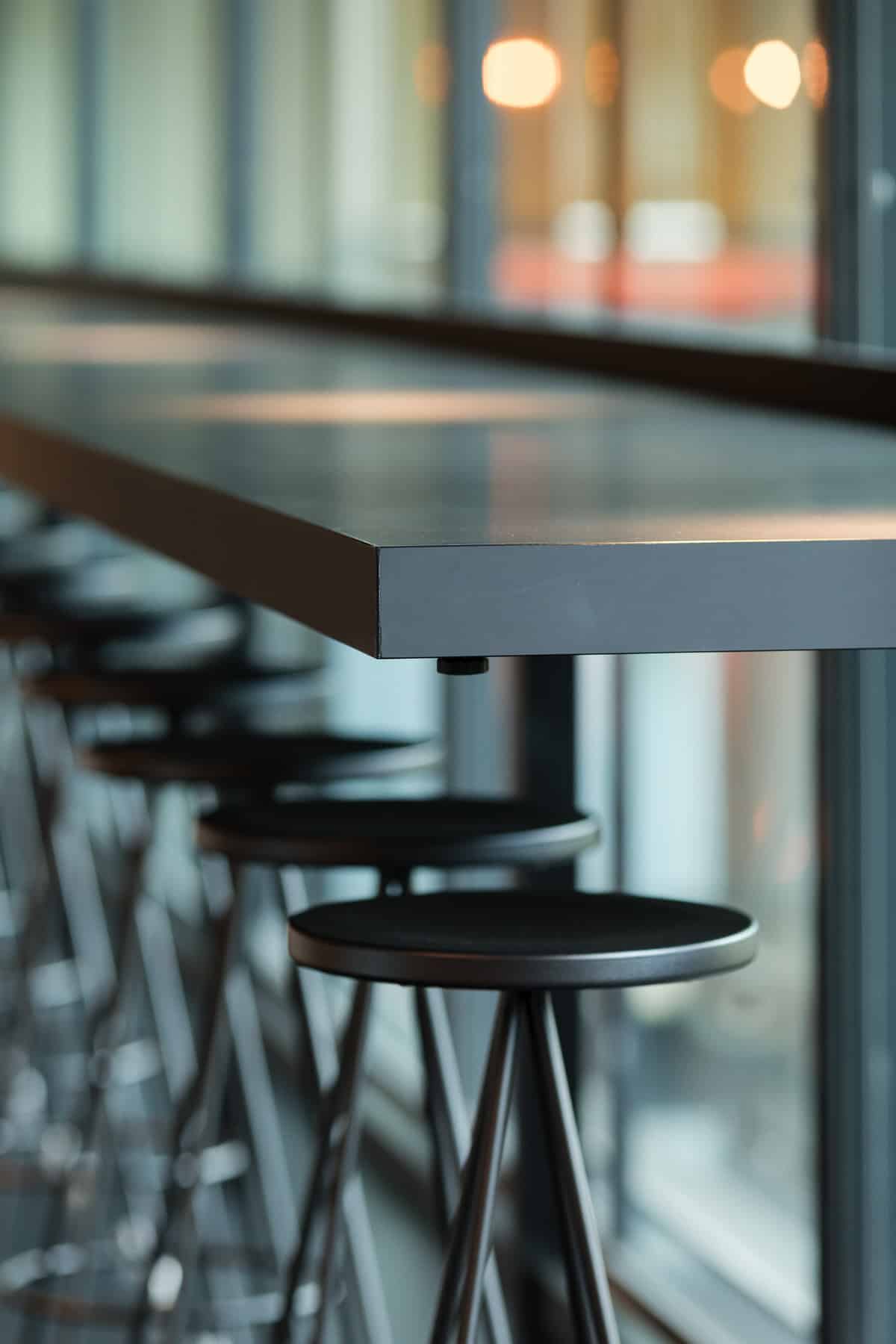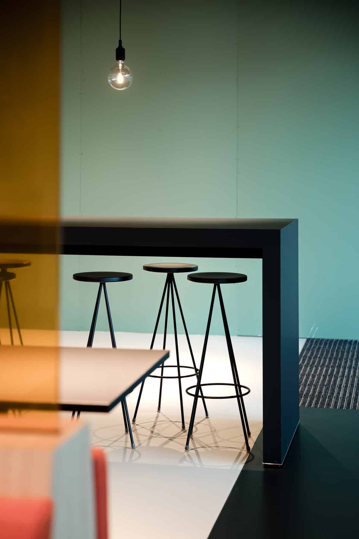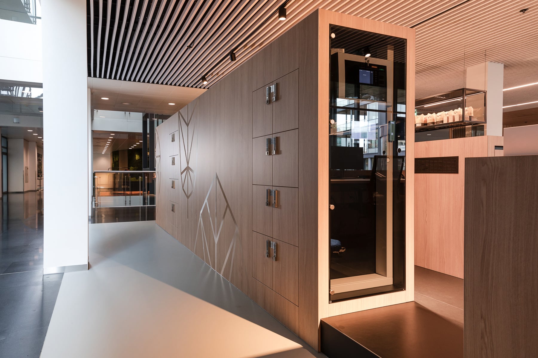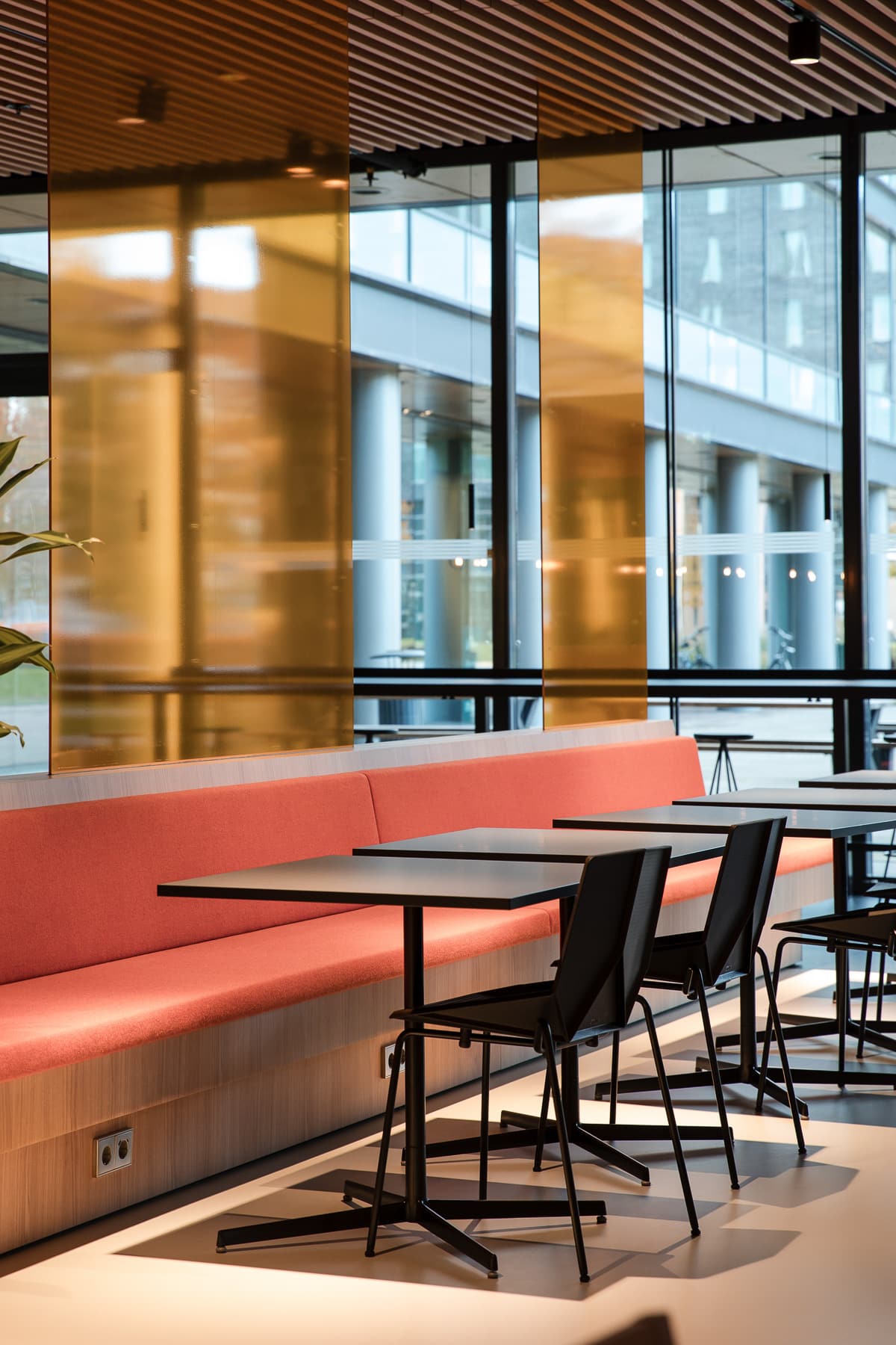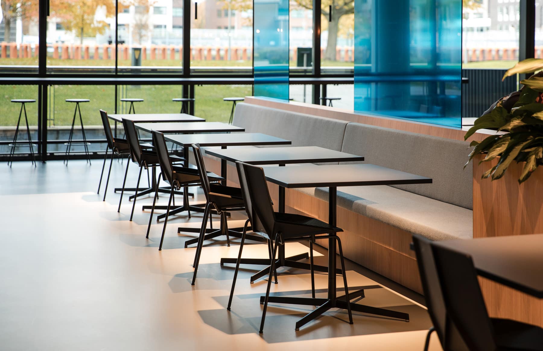 Een volledig op maat gemaakt interieur. De stijl van zowel de keuken, meubels en receptie lopen vloeiend in elkaar over. Meubels lopen over in plantenbakken, wat bijdraagt aan speelsheid en sfeer.