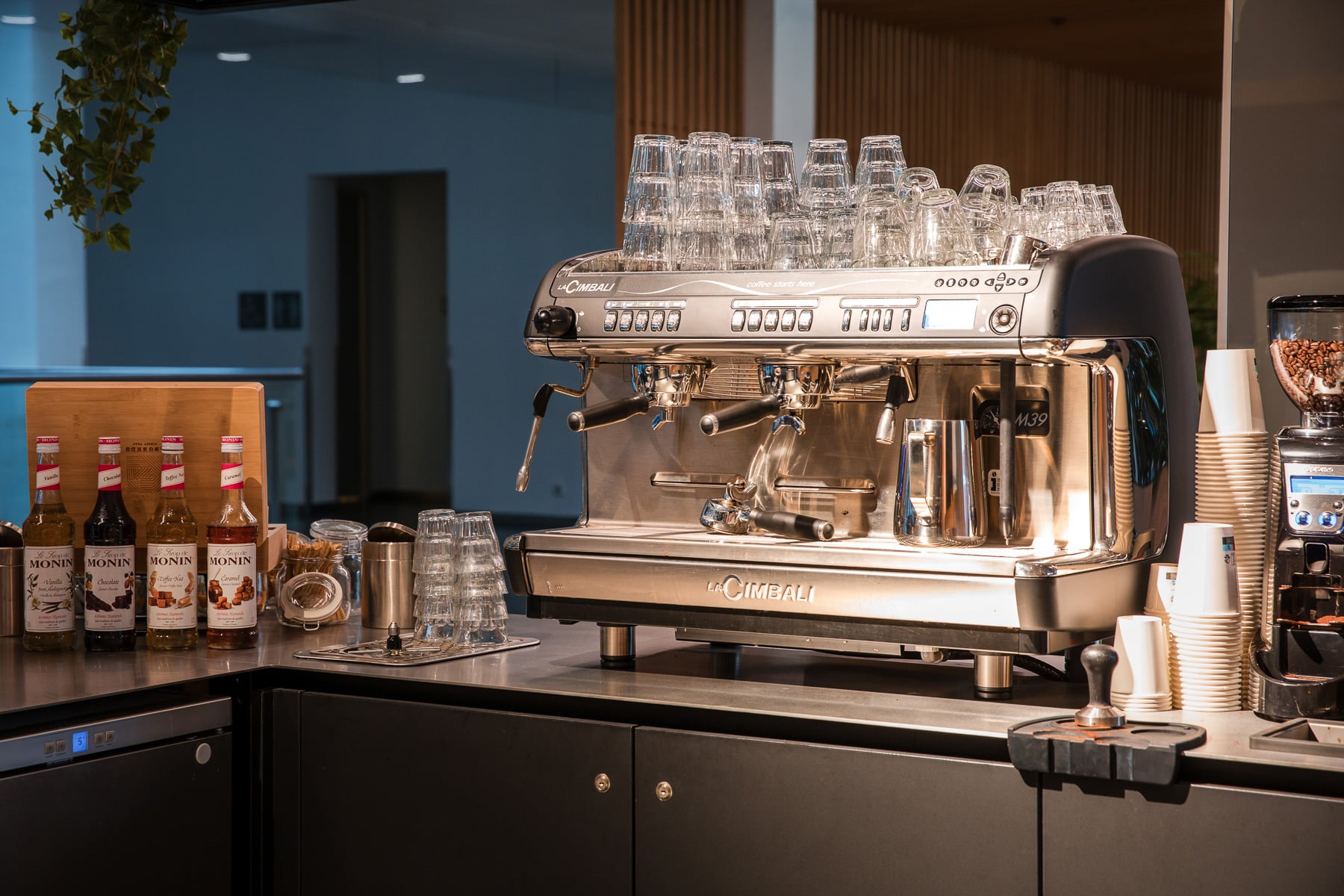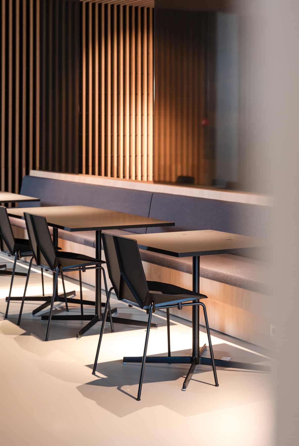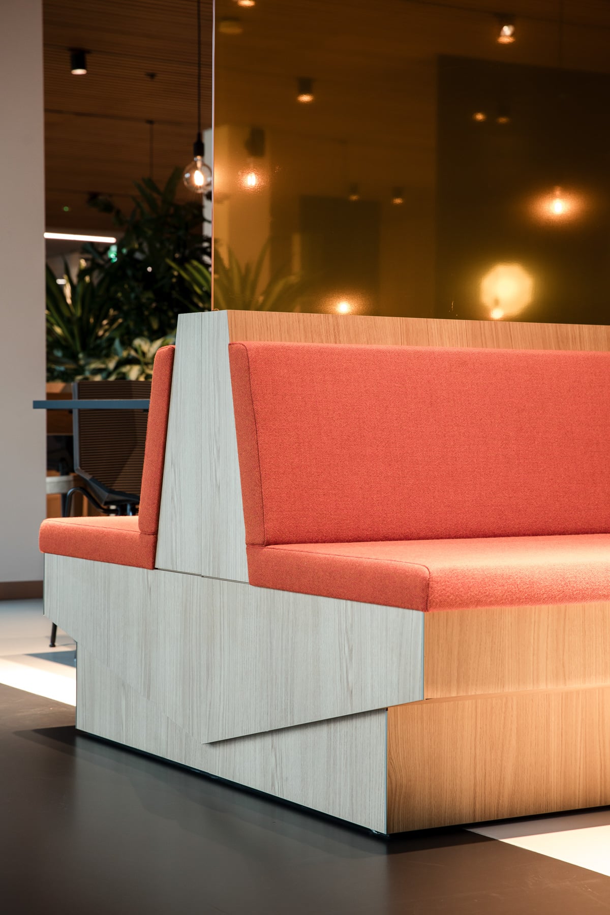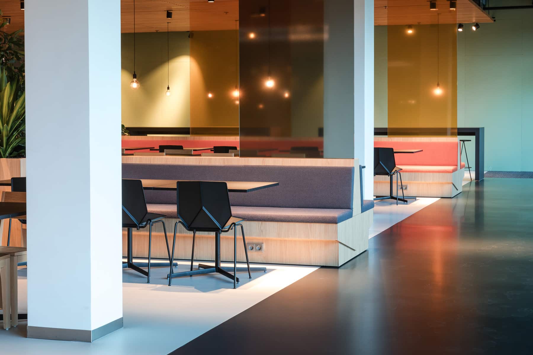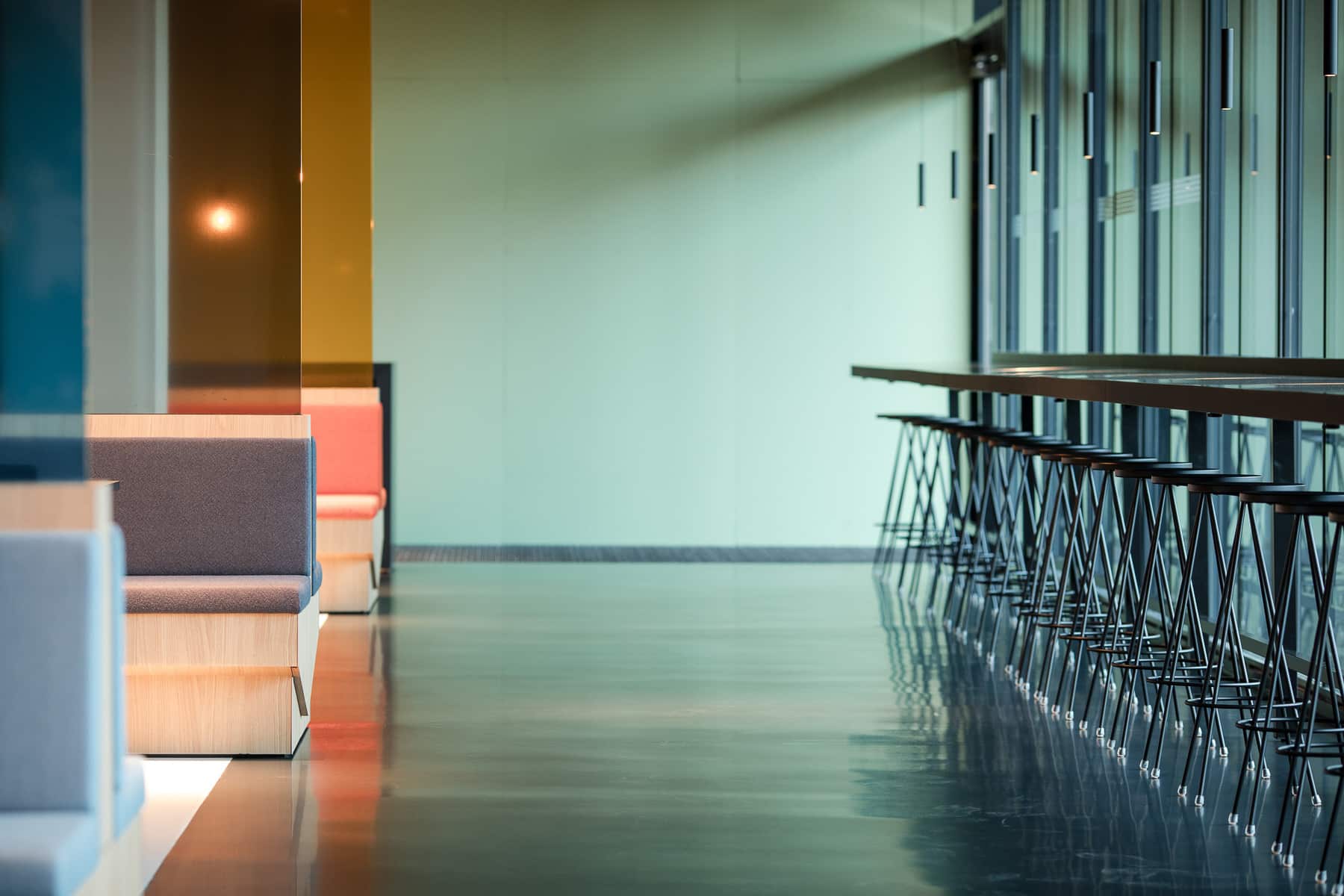 Een volledig op maat gemaakt interieur. De stijl van zowel de keuken, meubels en receptie lopen vloeiend in elkaar over. Meubels lopen over in plantenbakken, wat bijdraagt aan speelsheid en sfeer.