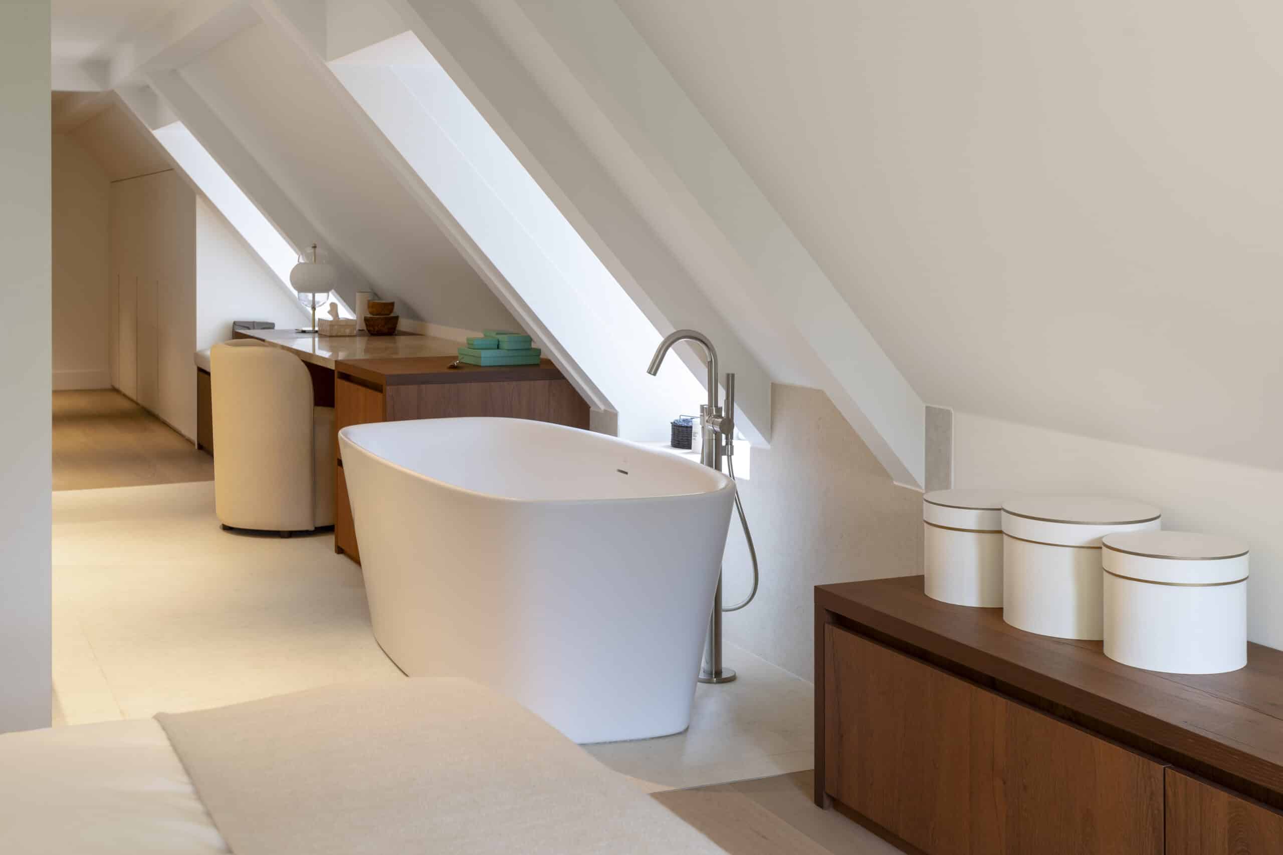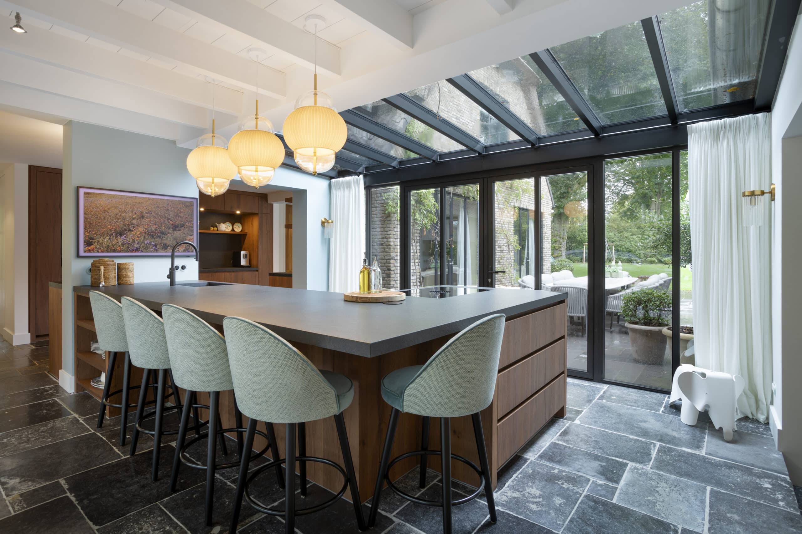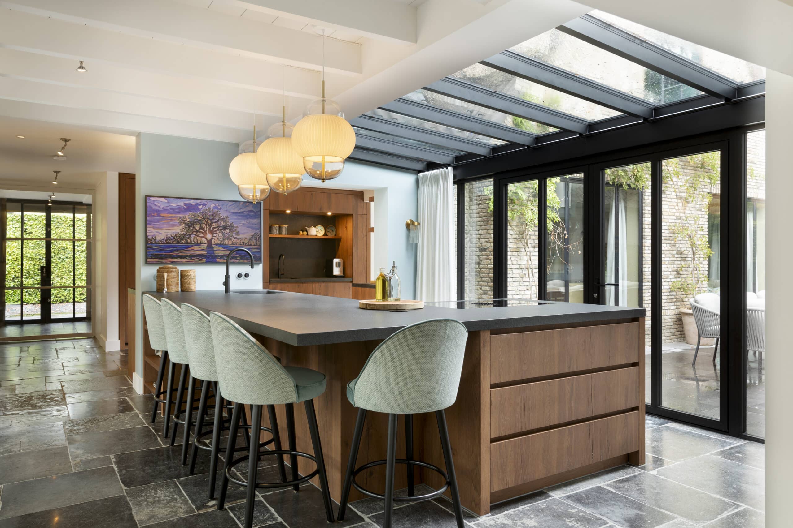 Op de begane grond mochten we de gigantische keuken op maat realiseren. Aan de bar, het verlengstuk van het kookeiland, is ruimte voor vijf personen. Hier wil je toch gezellig zitten met je geliefden?