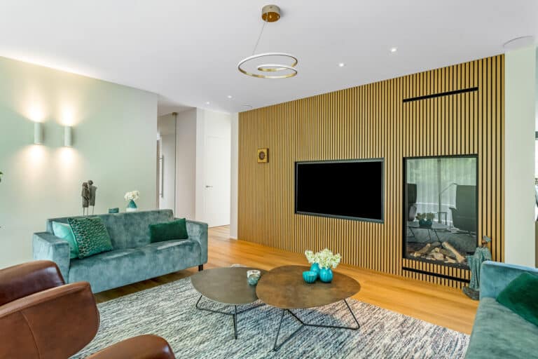 Een prachtig nieuwe badkamer! Aan ons de eervolle taak om ook een volledig op maat gemaakte walk-in closet met schuifdeuren te maken. In de woonkamer mochten kleine ruimtes optimaal worden benut door het toevoegen van lage kasten op maat. Eyecatcher is de weggewerkte tv in een gouden panelenwand. Het resultaat mag er zijn!